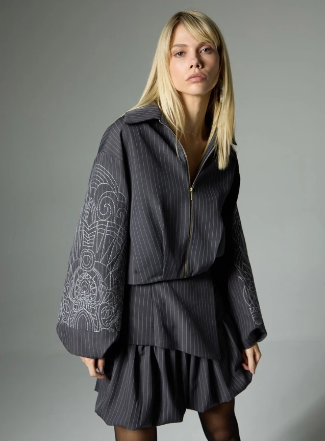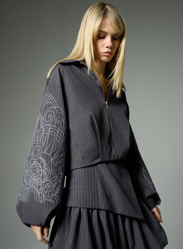 O grande diferencial está nas mangas volumosas com bordado texturizado, que adicionam dimensão, riqueza visual e personalidade à peça. O acabamento nos punhos mantém o caimento ajustado, proporcionando conforto e mobilidade sem comprometer a elegância.
