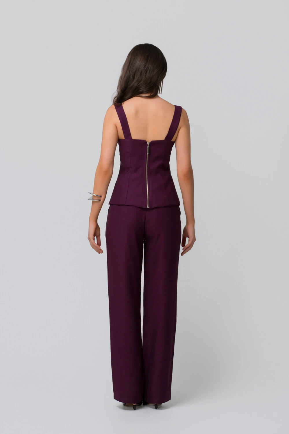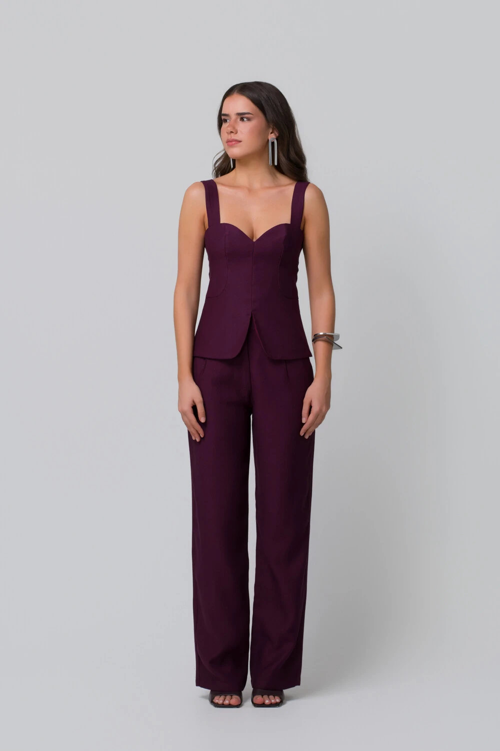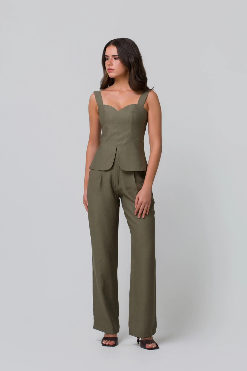 A calça de caimento fluido alonga a figura e garante movimento leve, criando um visual equilibrado entre conforto e estilo. O resultado é um look versátil, que transita com facilidade entre o dia e a noite.