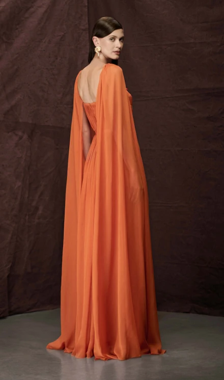 O grande destaque fica por conta das mangas capa em tecido leve e esvoaçante, que adicionam dramaticidade e um ar etéreo à peça. Esse detalhe transforma o vestido em uma escolha poderosa para ocasiões especiais, trazendo um efeito quase cenográfico ao visual.