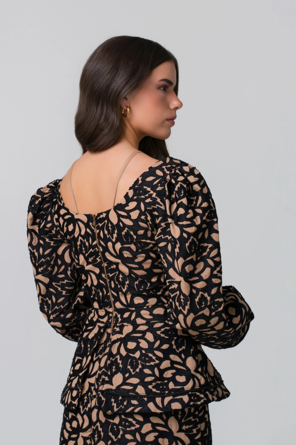 Confeccionado em tecido estruturado com delicado acabamento em renda floral, o modelo apresenta um contraste encantador entre o fundo nude e os desenhos em preto, criando um efeito visual luxuoso e atemporal. A silhueta é cuidadosamente desenhada para valorizar o corpo: o busto estruturado com decote levemente quadrado traz modernidade e feminilidade, enquanto a cintura marcada e o leve peplum conferem elegância e proporção.