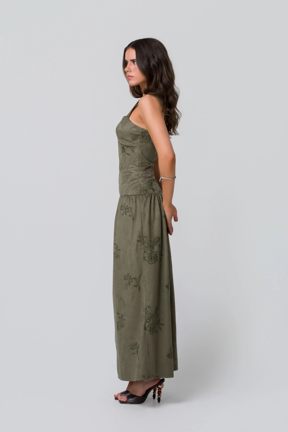 Confeccionado em suede macio ao toque, este modelo em tom verde oliva traz uma proposta contemporânea com inspiração atemporal. O tecido aveludado confere profundidade e riqueza à peça, enquanto a estampa floral sutil adiciona delicadeza na medida certa, criando um visual refinado e versátil.