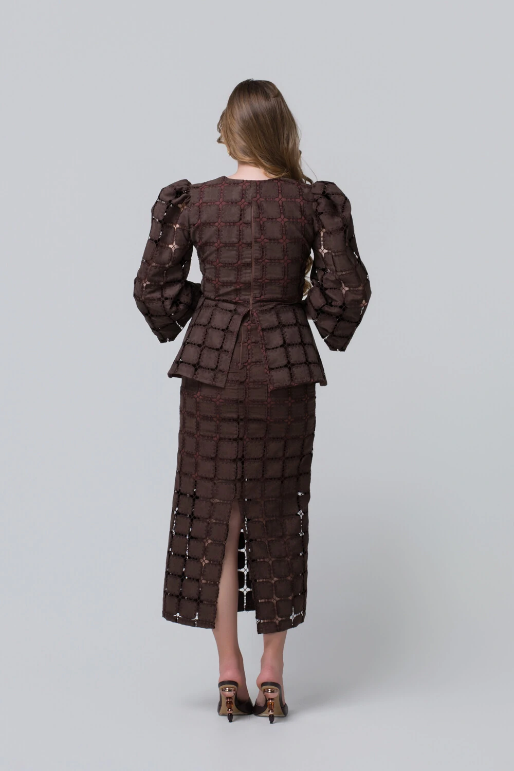 Confeccionada em tecido texturizado com recortes geométricos vazados, a peça revela um trabalho rico e minucioso, que confere profundidade e leveza ao visual. O comprimento midi reforça a proposta refinada, equilibrando modernidade e feminilidade com naturalidade.