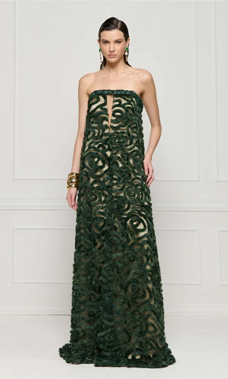 O modelo tomara que caia valoriza o colo e os ombros com elegância minimalista, enquanto a estrutura reta cria uma silhueta alongada e extremamente refinada. O grande destaque está no trabalho rico de sobreposição: um tecido com aplicações em relevo formando desenhos orgânicos e sofisticados, que revelam sutilmente a base em tom neutro, criando um jogo de transparência moderno e envolvente.