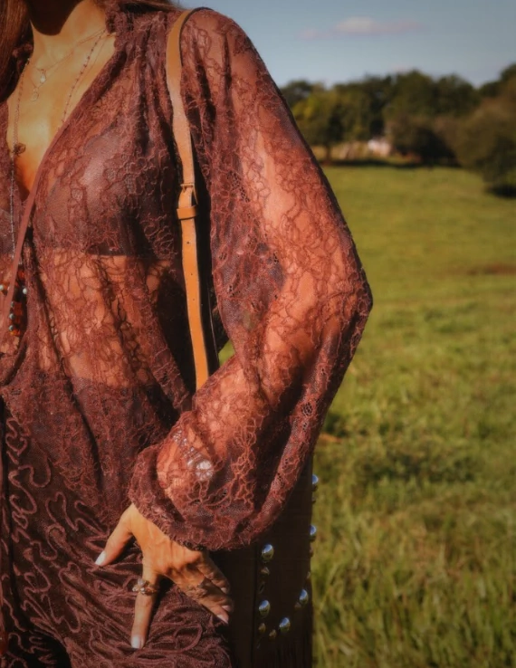 Confeccionada em renda trabalhada em tom terroso profundo, a peça revela e esconde na medida certa, criando um jogo de transparência elegante e sensual. A modelagem levemente solta, com mangas longas e caimento fluido, traz movimento e leveza, enquanto o decote com amarração frontal adiciona um toque artesanal e cheio de personalidade.