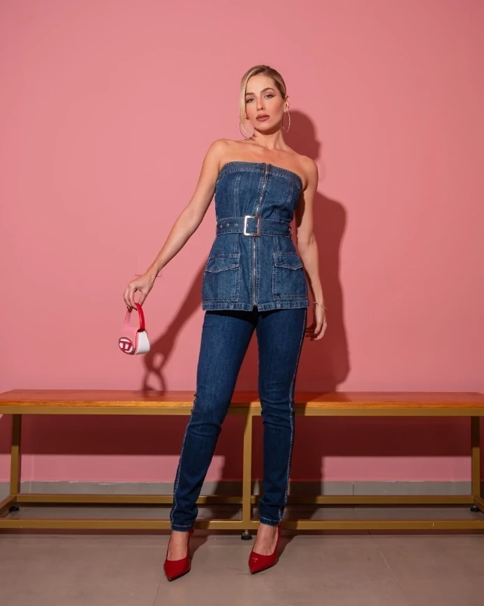 Com design tomara que caia, ele valoriza o colo de forma sutil e refinada, enquanto a estrutura em jeans proporciona firmeza e um caimento impecável ao corpo. O fechamento frontal por zíper adiciona um toque contemporâneo e prático, contrastando com o charme utilitário dos bolsos frontais.