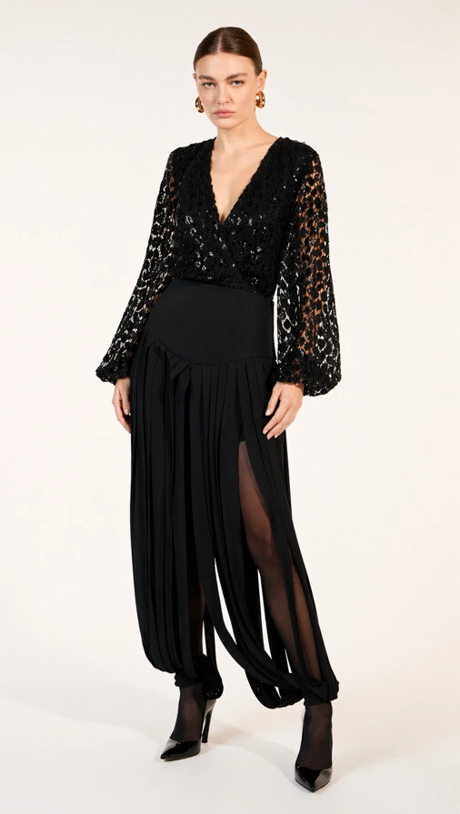Este look all black traduz elegância com personalidade em cada detalhe. A blusa, com decote profundo em V e modelagem levemente transpassada, é confeccionada em renda rica com aplicação de paetês discretos, criando um brilho sutil e refinado. As mangas longas e volumosas, com transparência estratégica, adicionam leveza e um toque dramático à composição.